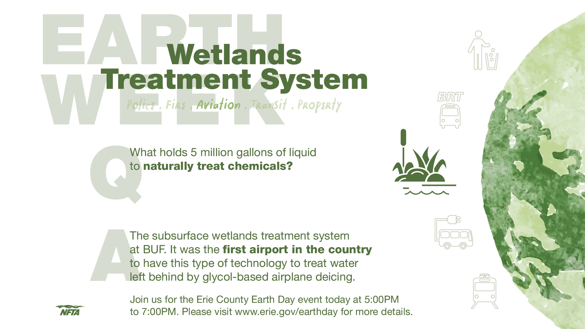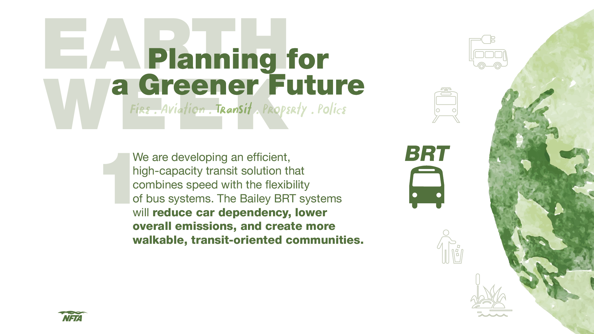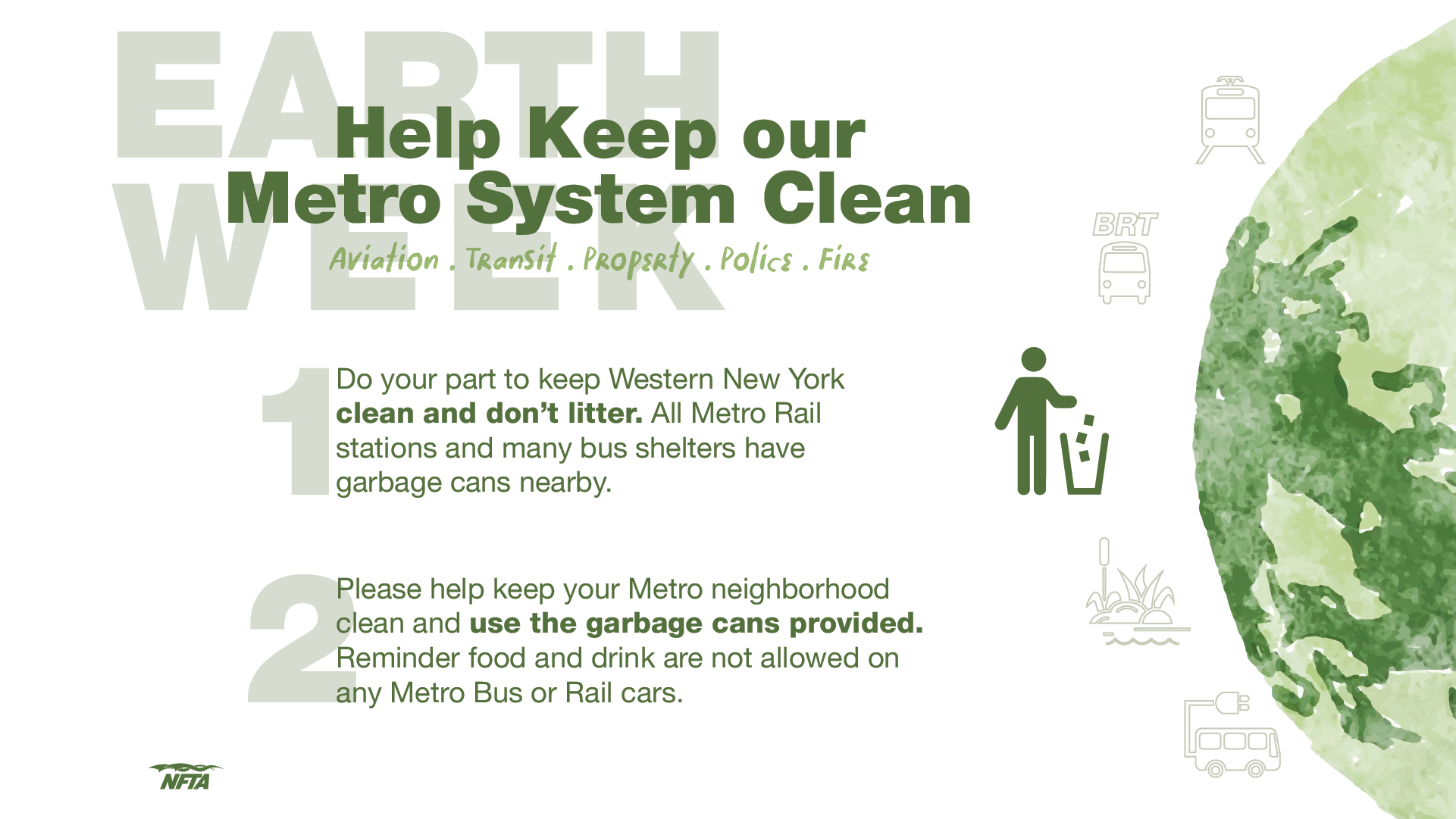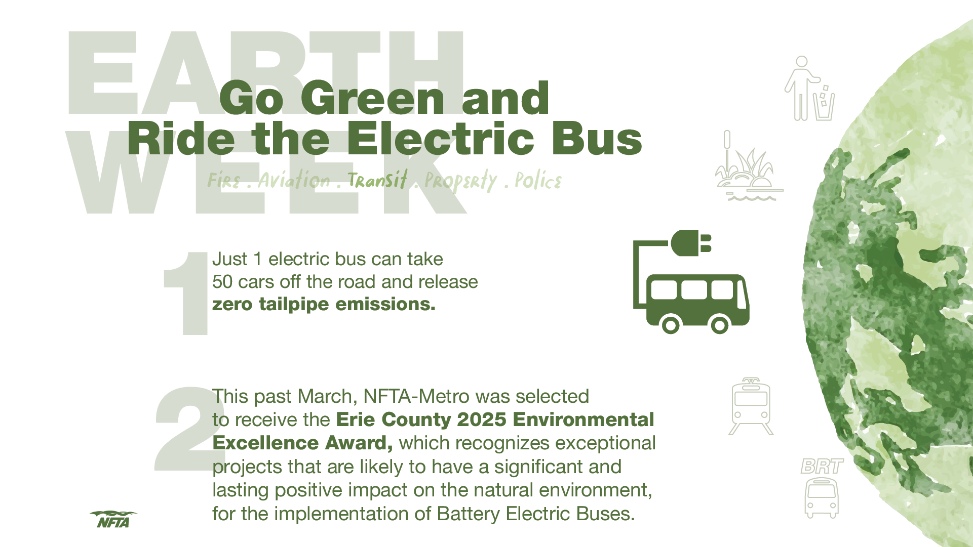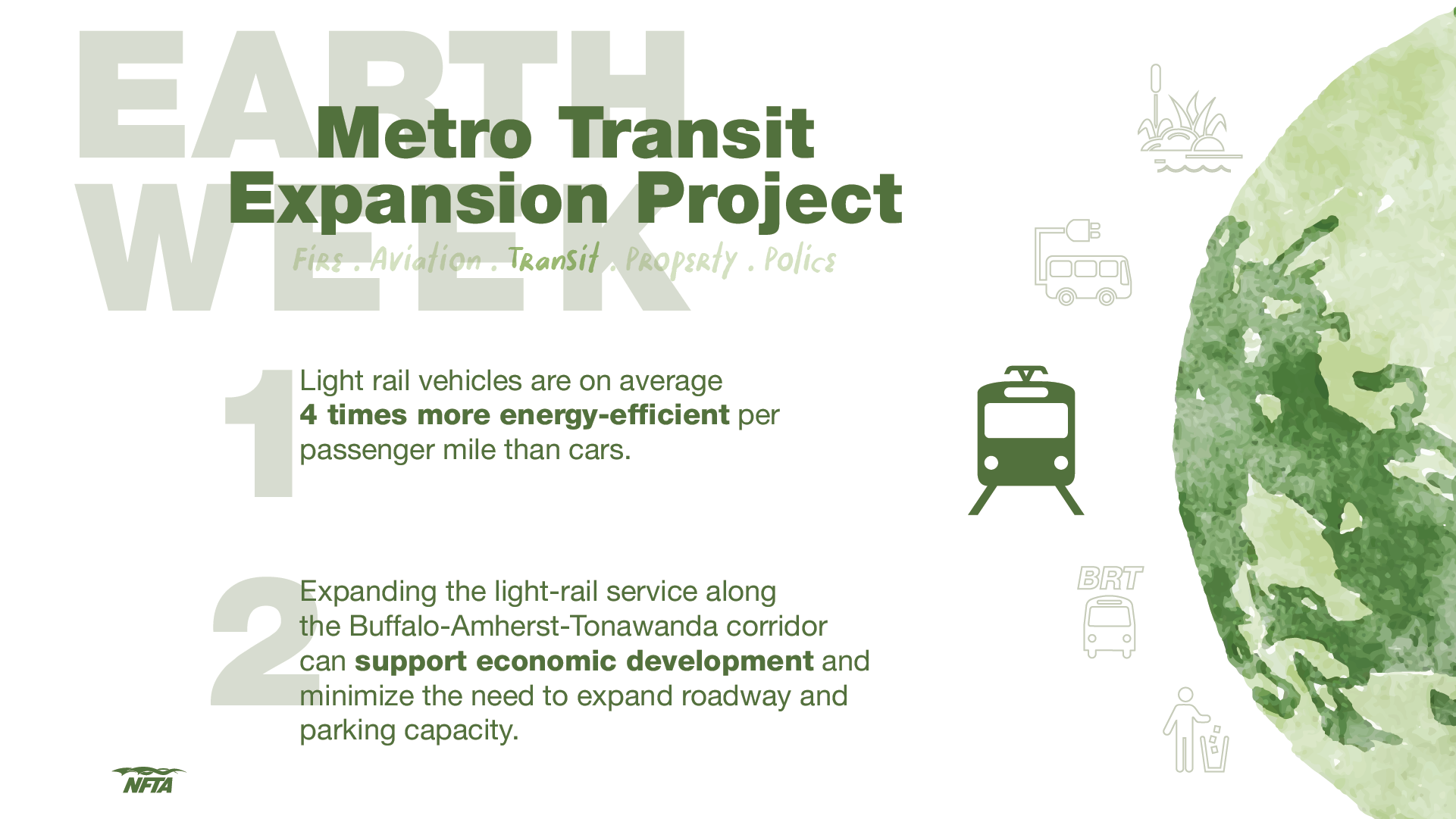The NFTA is committed to incorporating sustainable practices that consider economic, environmental, and social factors across our operations and long-term strategies. Our initiatives include installing electric vehicle charging stations at our airports, transitioning part of our Metro fleet to electric buses, and collaborating with various agencies on sustainability plans. We also prioritize economic development and promote transit-oriented projects while consistently encouraging sustainable transportation options.