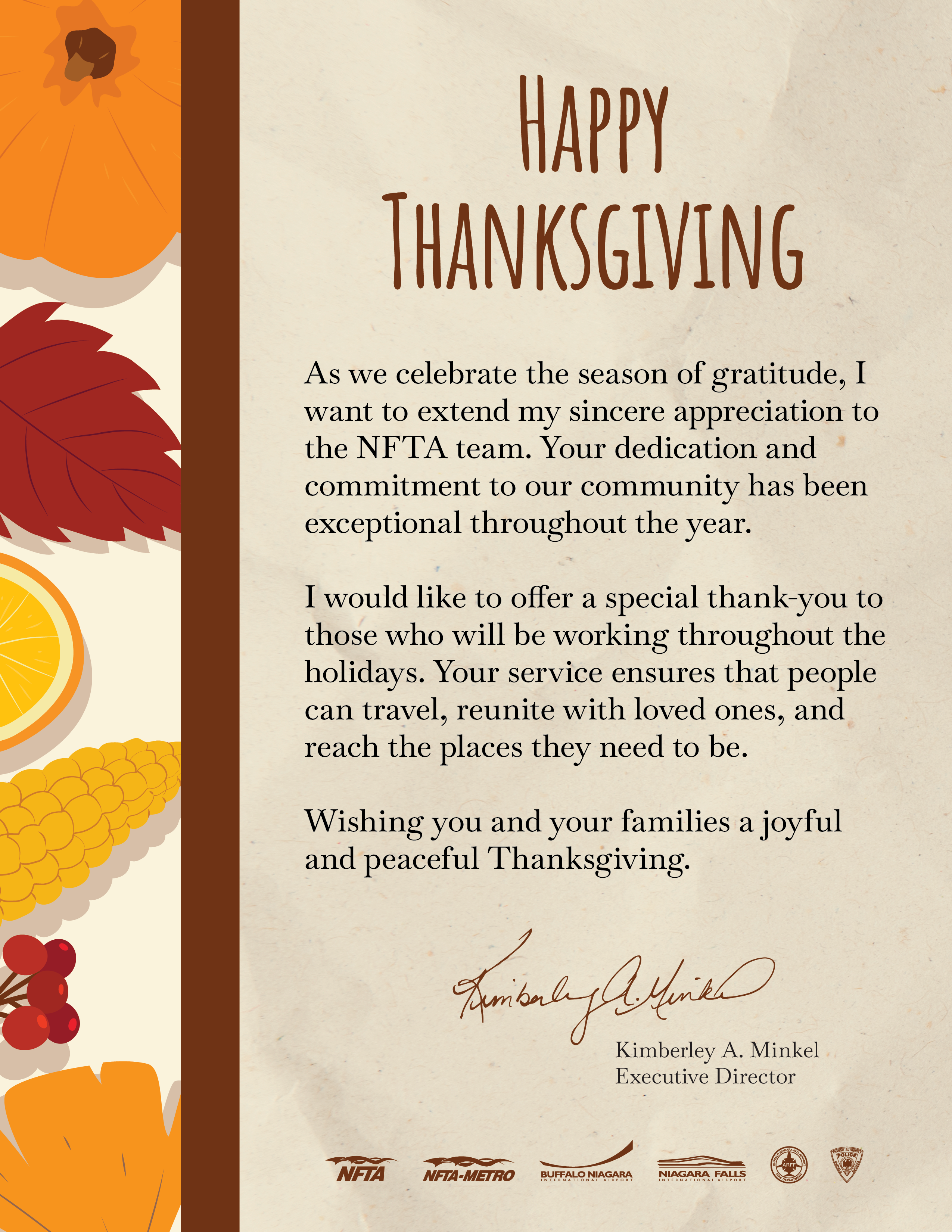 As we celebrate the season of gratitude, I want to extend my sincere appreciation to the NFTA team. Your dedication and commitment to our community have been exceptional throughout the year.