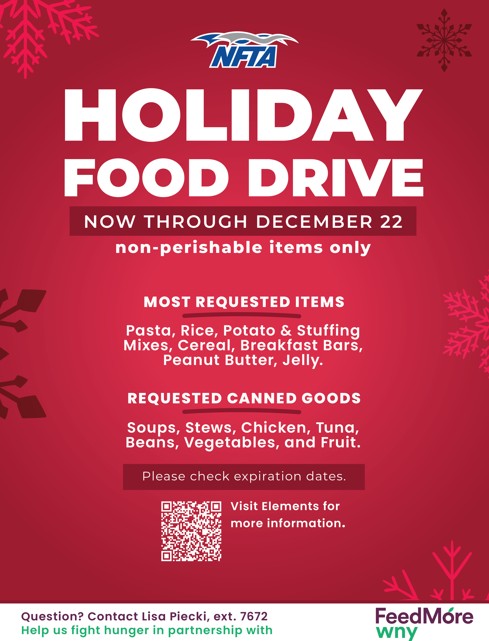 The NFTA is excited to partner with FeedMore WNY again this year for our Holiday Food Drive, which will run through December 22, 2025. Food insecurity affects many individuals in the WNY community, and together, we can make a meaningful difference. This annual food drive is a fantastic way to provide nutritious food to FeedMore WNY and help build a stronger community through collective action.