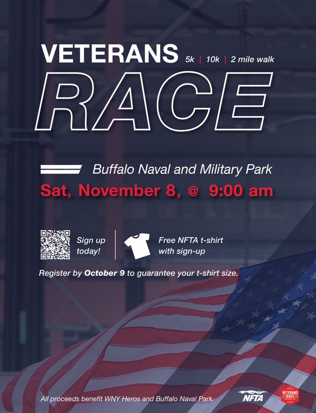 Join us in supporting our Veterans at the 2025 Veterans Race at the Buffalo Naval Park, with proceeds to benefit the WNY Heroes. There are several options available to participate. You can run/walk in the 5K or 10K race, or participate in the 2-mile walk. See more information below: