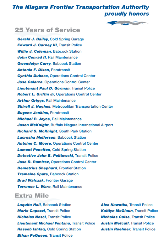 On Tuesday, April 14, the NFTA held its Service Awards Dinner at Salvatore's Restaurant to honor employees who have completed 25 years of service and those who have gone the extra mile.