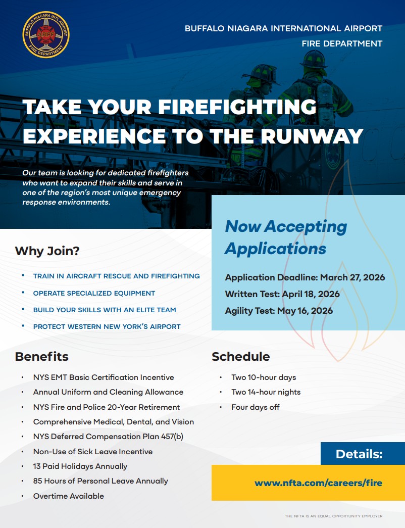 “We are looking for dedicated professionals who are ready to serve at Western New York’s most important transportation gateways,” says Fire Chief Bill Major. “Our airport firefighters are highly skilled, highly trained, and essential to maintaining the safety and security of millions of passengers each year.”