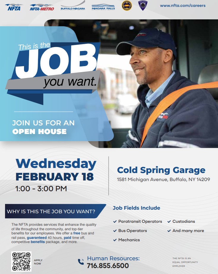 We are excited to announce that our next open house is on Wednesday, February 18, 1-3 p.m. at Metro's Cold Spring Garage. Please be sure to share this with family and friends. Also, don't forget about the NFTA's Employee Referral Program; you can earn big bonuses for sending great candidates our way.