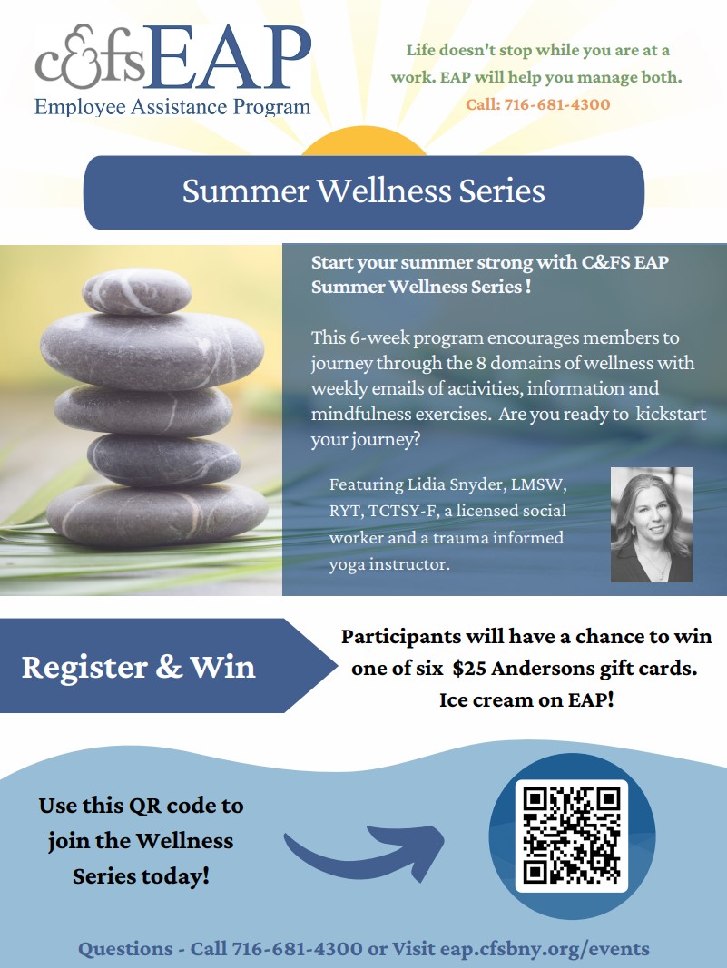 This summer, EAP wants to share tools with you to support your wellness journey. We have joined Lidia Snyder, LMSW, RYT, TCTSY-F, a licensed social worker and a trauma-informed yoga instructor, to develop a guided wellness journey exclusively for EAP members. We hope you will join us! See the attached printable pdf or download it here: Summer Wellness Series.